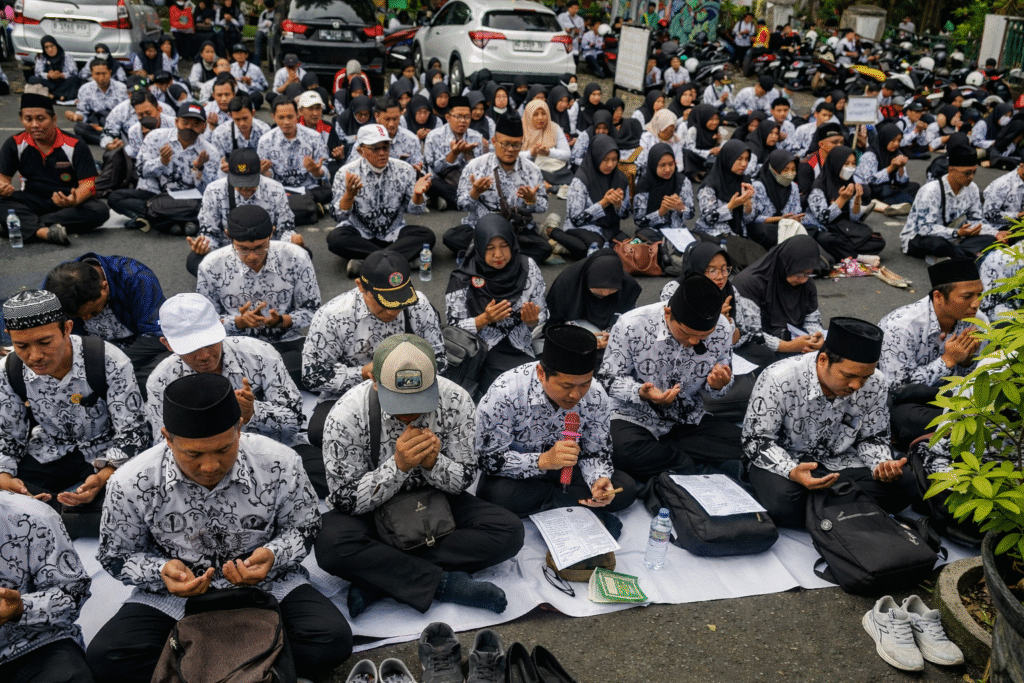 Di luar ruangan, ribuan guru lain mengawal dengan sabar. Mereka tak berteriak berlebihan, tapi memanjatkan istigotsah mengetuk langit untuk terkabulnya tuntutan mereka. Yang mereka bawa bukan sekadar tuntutan, melainkan harapan agar suara mereka tak lagi menguap begitu saja.